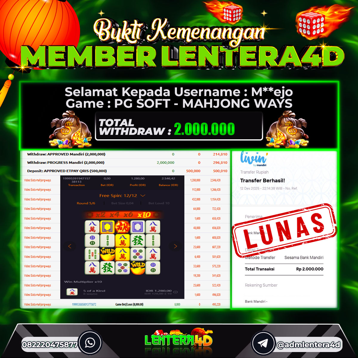 JACKPOT MAIN MAHJONG WAYS 12 DESEMBER 2025, Jackpot Slot Gacor, Kemenangan Slot, Bukti Kemenangan Slot, Kemenangan Slot PG SOFT, Menang Slot online, Slot Gacor, Situs Aman Terpercaya, WD Berapapun Pasti DI Bayar Tuntas, Maxwin Slot Online.