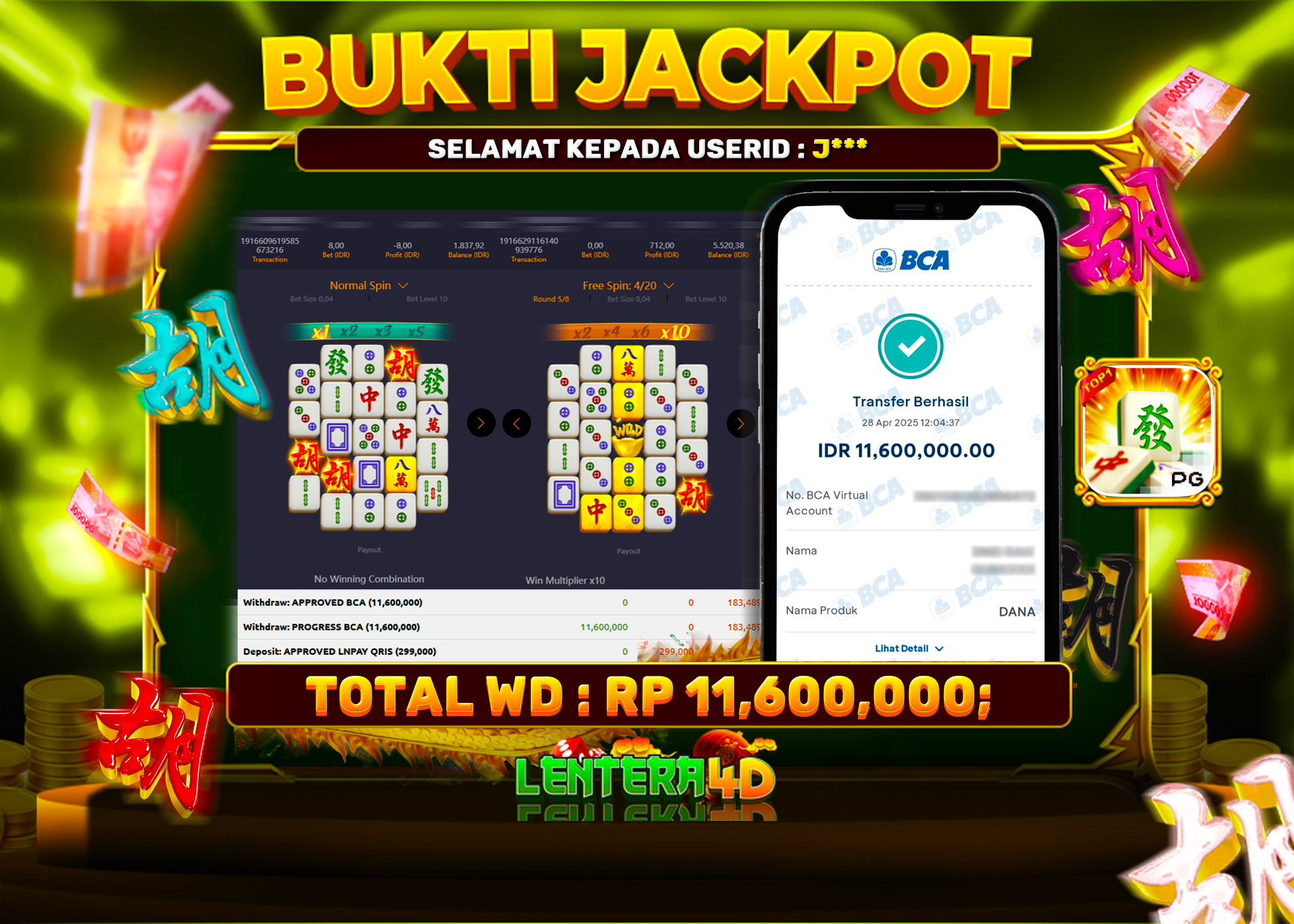Setiap hari, member Lentera4D berhasil meraih jackpot besar dari berbagai provider slot ternama yang kami sediakan, seperti Pragmatic Play, Habanero, PG Soft, dan masih banyak lagi. Kami secara rutin menampilkan bukti screenshot atau rekapan kemenangan yang berhasil diraih, mulai dari kemenangan ratusan ribu hingga puluhan juta rupiah. Semua slip kemenangan ini kami hadirkan untuk membuktikan bahwa di Lentera4D, peluang menang itu nyata.