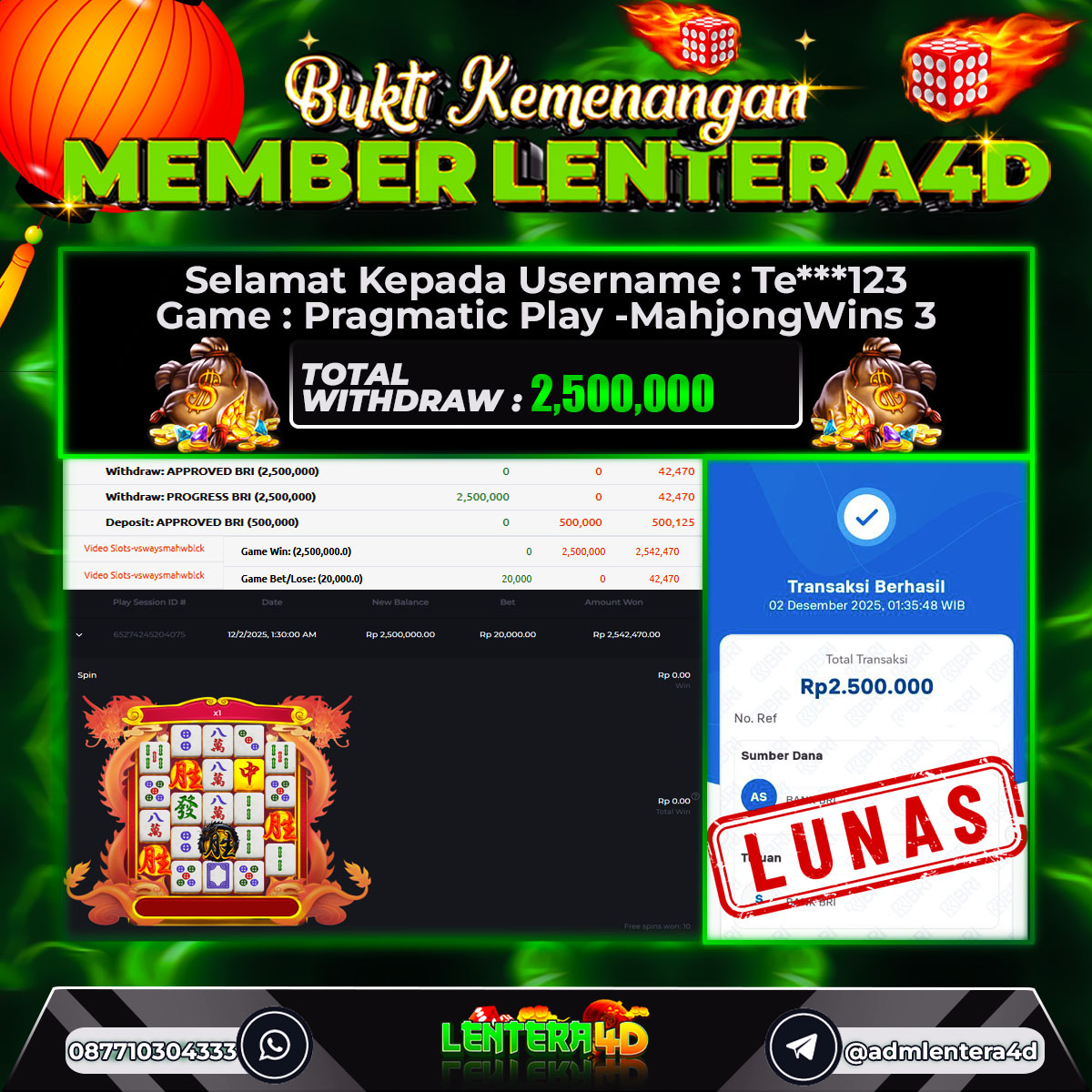 Setiap hari, member Lentera4D berhasil meraih jackpot besar dari berbagai provider slot ternama yang kami sediakan, seperti Pragmatic Play, Habanero, PG Soft, dan masih banyak lagi. Kami secara rutin menampilkan bukti screenshot atau rekapan kemenangan yang berhasil diraih, mulai dari kemenangan ratusan ribu hingga puluhan juta rupiah. Semua slip kemenangan ini kami hadirkan untuk membuktikan bahwa di Lentera4D, peluang menang itu nyata.