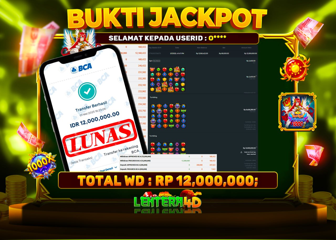 Lentera4D dikenal sebagai situs terpercaya yang selalu menghadirkan pengalaman bermain slot online yang aman, fair, dan berlisensi resmi. Di sini, kami tidak hanya sekadar memberikan janji, tapi bukti nyata berupa slip kemenangan yang dapat Anda lihat secara langsung.