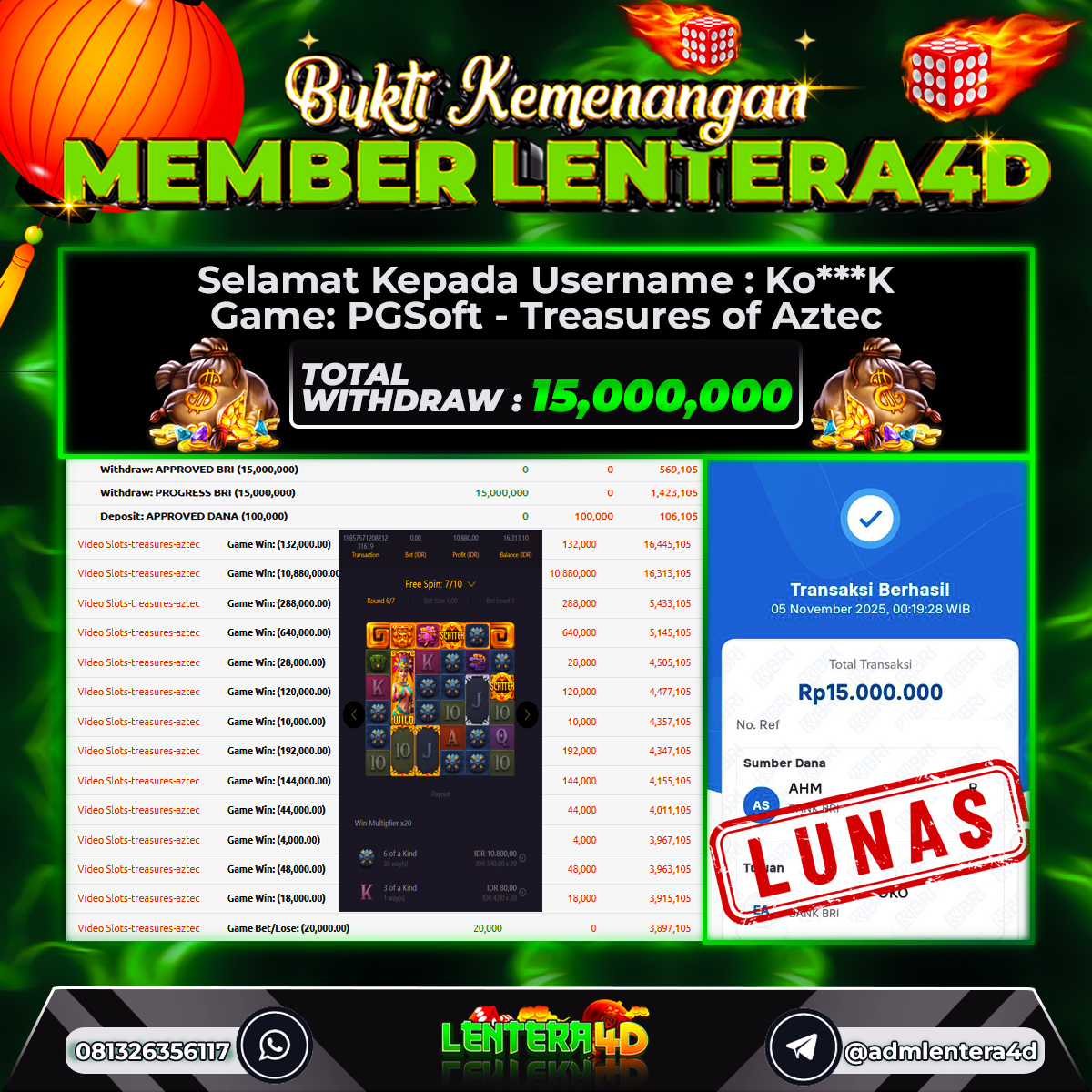 JACKPOT TREASURES OF AZTEC 05 NOVEMBER 2025, Jackpot Slot Gacor, Kemenangan Slot, Bukti Kemenangan Slot, Kemenangan Slot PG SOFT, Menang Slot online, Slot Gacor, Situs Aman Terpercaya, WD Berapapun Pasti DI Bayar Tuntas, Maxwin Slot Online.